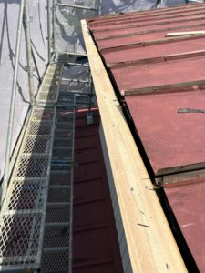 今回はカバー工事ということで既存の屋根材は基本的には残し、外すのは心木に被せてあるカッパというキャップと棟板金のみであとは腐食した材木の交換及び補修のみです。