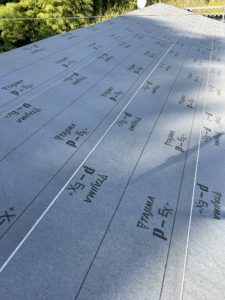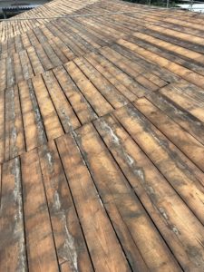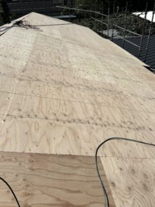 足場を掛けセメント瓦を撤去後に新規野地板、ルーフィングまで施工し今は屋根材の加工待ちの状態です。