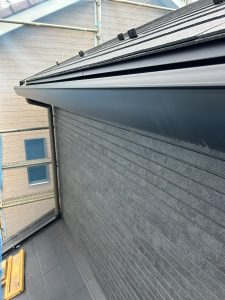 画像では分かりづらいですが今回のお宅は軒どいがブラックで竪どいが黒っぽいブラウンで屋根の上に這わせてある竪どいはブラック。と外壁や屋根の色に合わせて色を選ぶことも可能です。