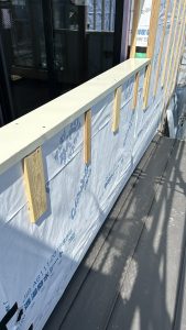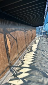 白っぽい板金が捨て笠木です。この施工方法のメリットは固定方法だけではなく2重の笠木になるため防水性がアップすることです❗