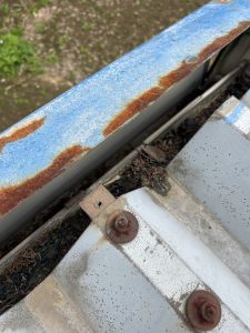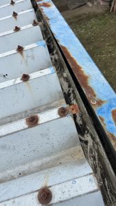 折半屋根雨どいの枯れ葉詰まり。それが原因で雨水が流れずオバーフローし雨漏りの原因になっていました。