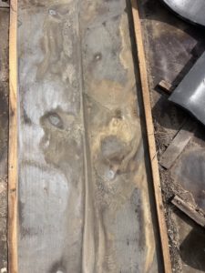 先ほど雨漏りはしていないと書きましたが谷板金を剥がすとご覧のように雨水が入った形跡がよくわかります。下葺き材でかろうじて部屋までは染みていませんが間違いなく天井裏には染みています。