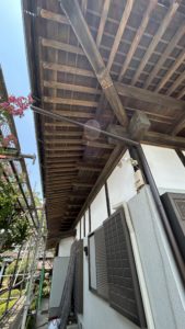 化粧垂木に広小舞3段。とうぜん通常の受け金具では適用することもなく特注品にてご対応です。